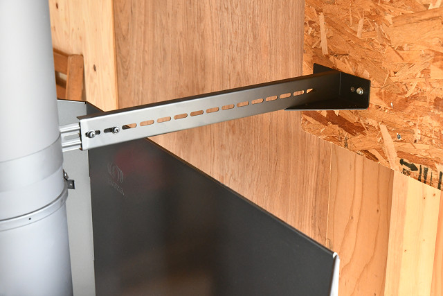 薪ストーブ本体になるべく近い低い位置(炉壁のすぐ上)で煙突を壁面に固定するのだ。その固定位置の下ではスライド煙突を使わずに、万一の地震の揺れで薪ストーブが飛び跳ねたり、転倒したりすることを防ぐ意図だ。この対策をするのと、しないのでは、安定感が全然違う。機会があれば、施工時にビフォーアフターを実感して欲しいところだ。