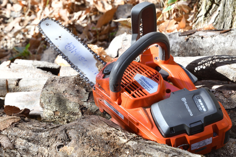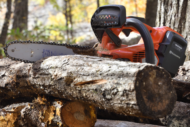 エンジンチェーンソーよりも、気軽に使えるのがバッテリーチェーンソーの魅力だ。直径20センチクラスの原木や、枝払いに活躍する。