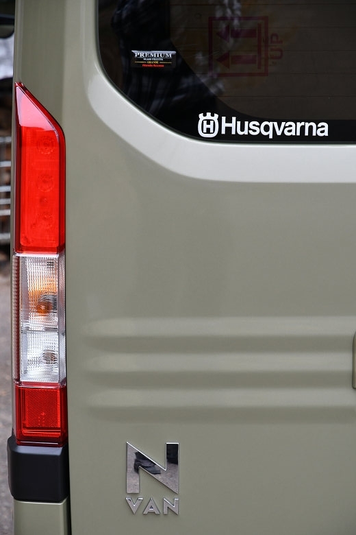 取引商品のハスクバーナの立体的なステッカーが手元にあったので、N-VANのリアガラスに貼ってみた。