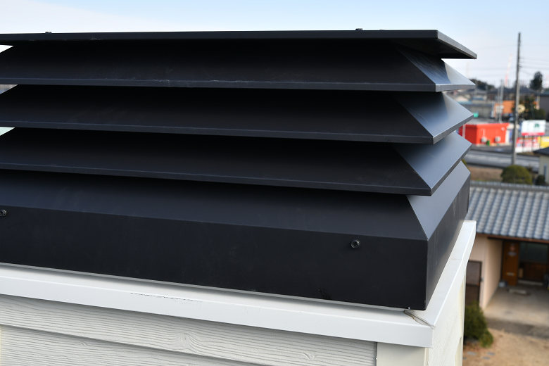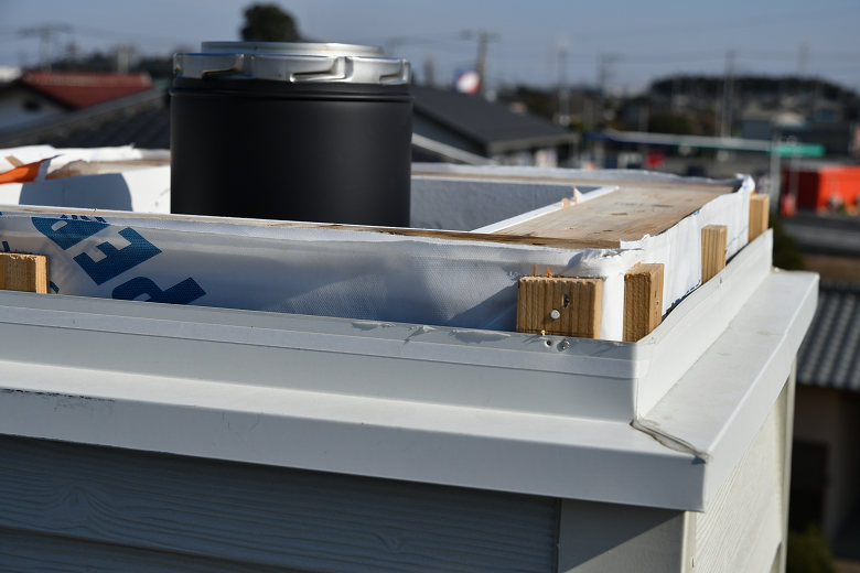 既製品の角トップは1辺の寸法が800ミリ角なので、打ち合わせ時には角トップが上からチムニーに被さるクリアランス15ミリをみて、一辺770ミリで作ってもらうように打ち合わせしている。しかし、今回の現場は何故か、指定した寸法より大きく作られていた。