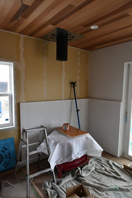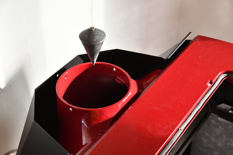 重い大型の薪ストーブの設置の場合には、「とりあえずここらへんでいいや」という感じで仮置きすると、後になってから位置を微調整する時に作業がとても大変だ。搬入時点で、最初から、ある程度正確な位置を出して置いた方が良い。そのために煙突芯の位置から下げ振りを垂らして、そこに煙突の位置を合わせて設置している。