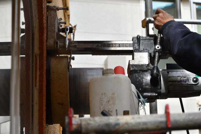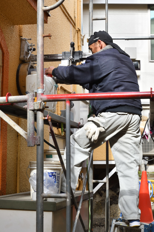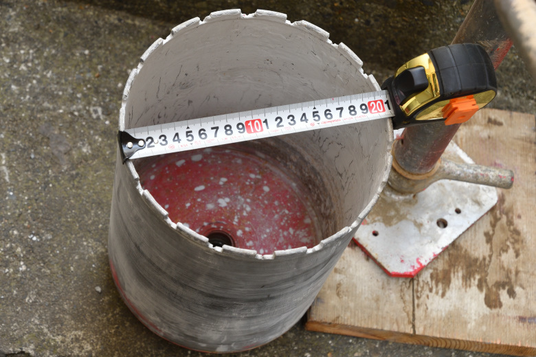 普通の木造建築だったら丸鋸で一辺が450ミリの正方形で開口するだけなので自分でもできるけど、今回の現場はコンクリートブロックの外壁だったので、専門のコア抜き業者を手配した。