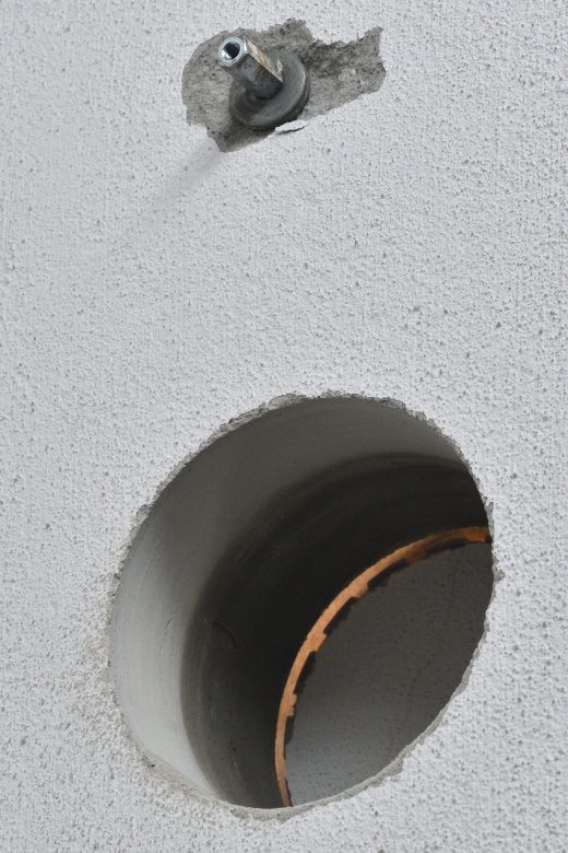 煙突貫通部分はRCではなくブロック作りのためアンカーが効かないので機械固定用の通しボルトの穴を貫通部分の上に開けている。作業完了後にコーキングでふさぐことになる。