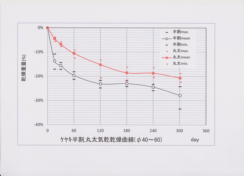 割るのが面倒で、ついついそのまま薪棚に突っ込んでしまいがちだけど、ひと手間かけて割ってやるだけで燃え方が全然違うことが、この数字からもはっきりと解る。