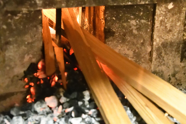 薪の投入の前に、熾火をヒートライザー周辺に集めてやって、火吹き竹(パイプ)のようなものを使って、奥の熾火に空気を送り込んでやって、熾火を元気にしてから細目の焚きつけをヒートライザーの奥に突っ込む。ゴゴーっと音が出て炎が周辺の煙を巻き込みながら吸い上げる状態になるのをじっくりと待つ。焦って太目の薪をボコボコ置かないことだ。