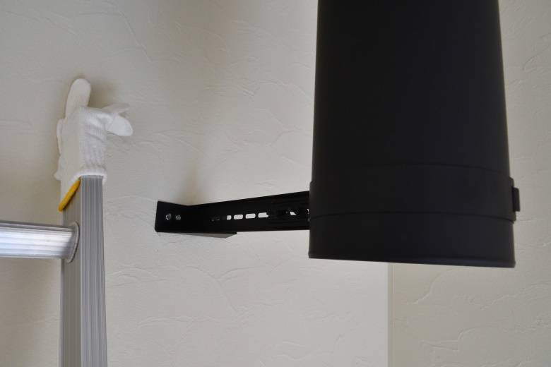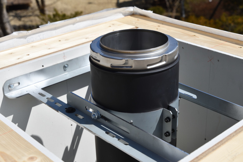 特殊な寸法のチムニーだったので、いつもとは違う煙突固定金具を使用した