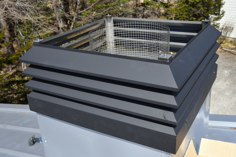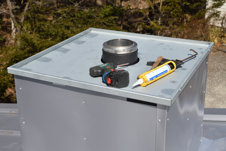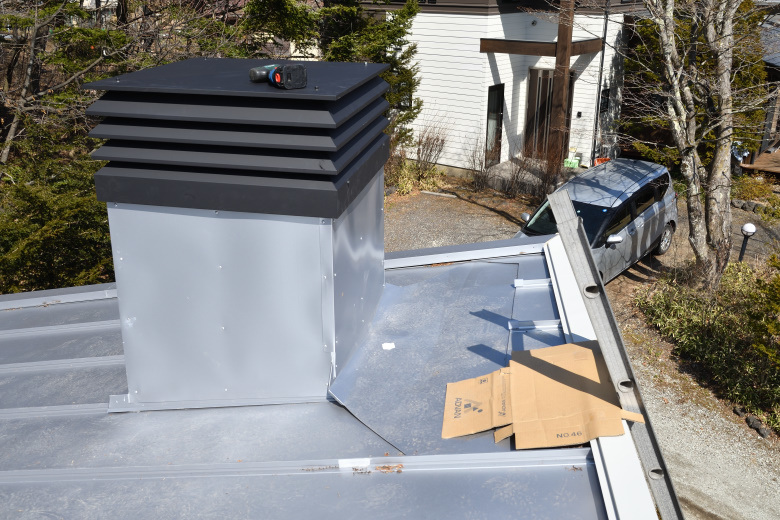 角トップのベースを取りつけて、チムニーとの取り合い部分をコーキングする