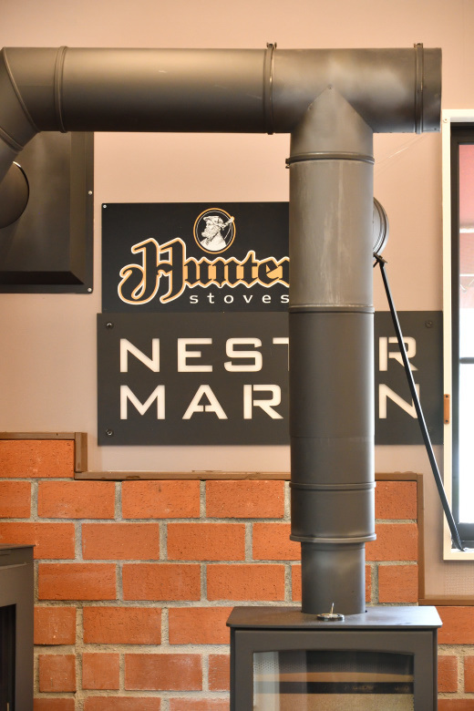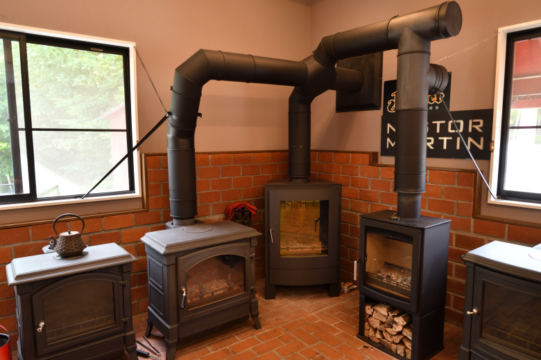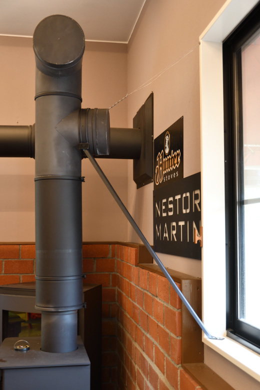 「平屋の壁抜きで、煙突高さを全然稼げない」&「複数台を煙突に接続するためセオリーから外れた極端に長い横引き」&「既存物件で内装剥がして、下地を入れるほど大がかりなスケルトン状態での内装工事はできない」という二重苦、三重苦の悪条件だ。煙突の配管条件としては最悪に近い状態だ。上手に焚きつけしないと煙が逆流するし、燃え方も正直イマイチだ。ストレートに屋根から抜いた煙突とは比較にならない悪条件だ。