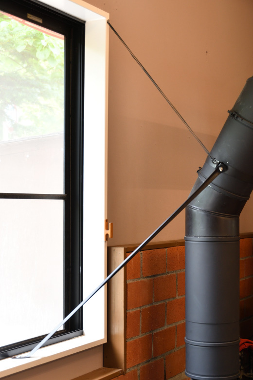 これまで室内側の煙突を、固定や支えなしに横引きで強引に接続していたので、スライド煙突が重力で縮んで煙突の横引き部分が目で見て、誰でも明らかに判るくらい下がる方向に傾いていた。7月9日の写真を良く観察すると判ると思う。見た目も気持ち悪いし、地震の時に揺れて外れるのも嫌なので最低限度、無理なく現状でできる程度に煙突固定をした。あまりカッコ良いとは言えないけど、手持ちの部材で、限られた目視確認できる固定位置を使って、やれることをしておいた。内装壁面内の間柱に打つ方がスマートなのだけど、部材の都合の良いところにステーのビス穴がこない。斜めにステーが入るので、ステーの3つのビス孔全部に間柱にかかることが物理的に無理なのだ。