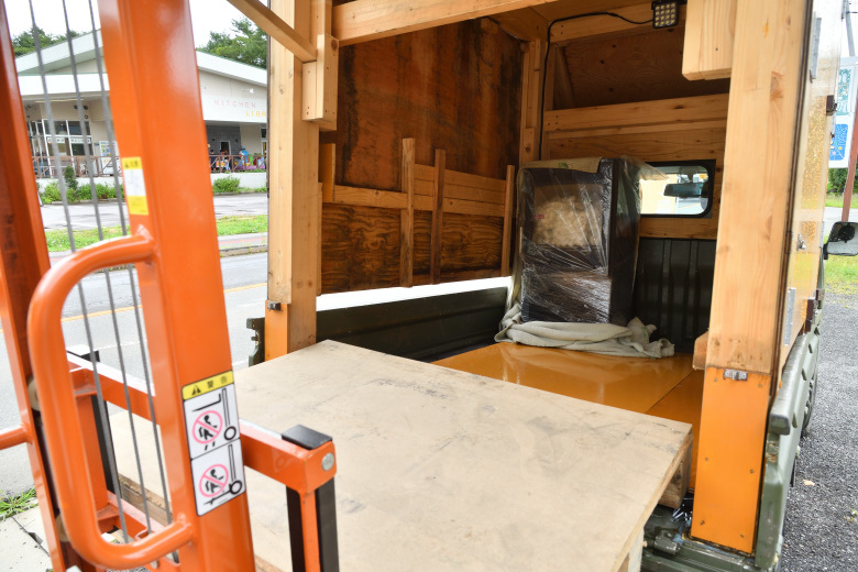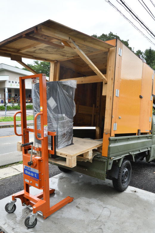 運送会社のトラックが去ったら、すぐに軽トラックを土間コンクリートに横付けして、荷台にリフトで積み込む