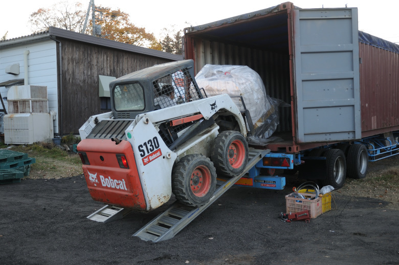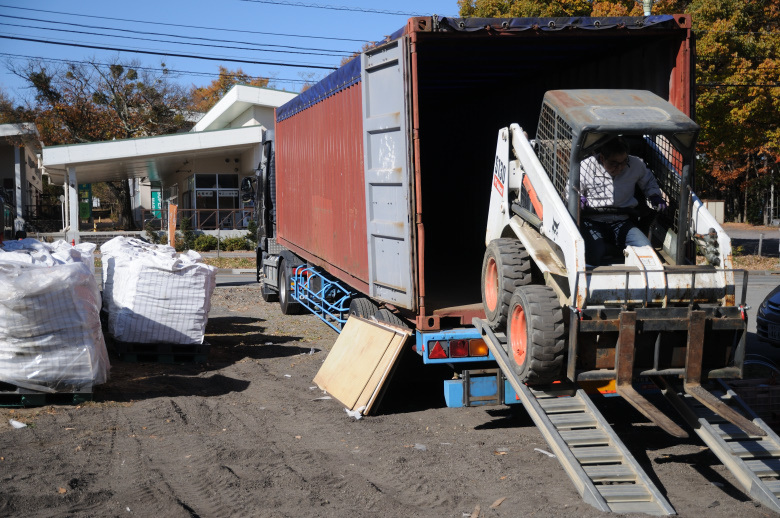重松さんのブログの記事には、私がパレットにつけた帯を取り外している後ろ姿が写っている。二日目の作業なので、効率良く降ろすアイデアが浮かんで、試してみたところ、上手くいった。