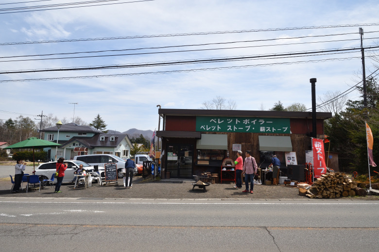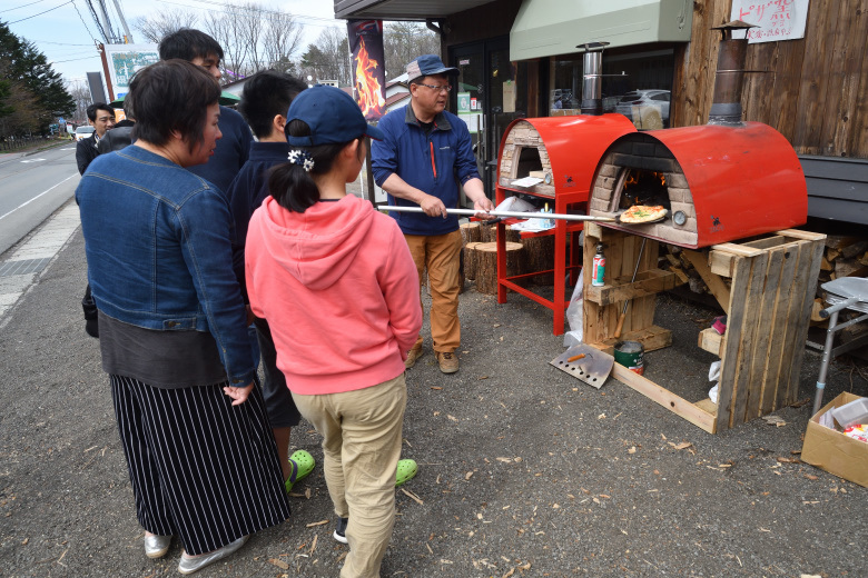 GW後半戦は、かわはら薪ストーブ本舗北軽井沢店の店頭でピザ窯実演を行った。取引先のエコレットカンパニーの社長の高山さんが作るピザが来場者に振舞われた。