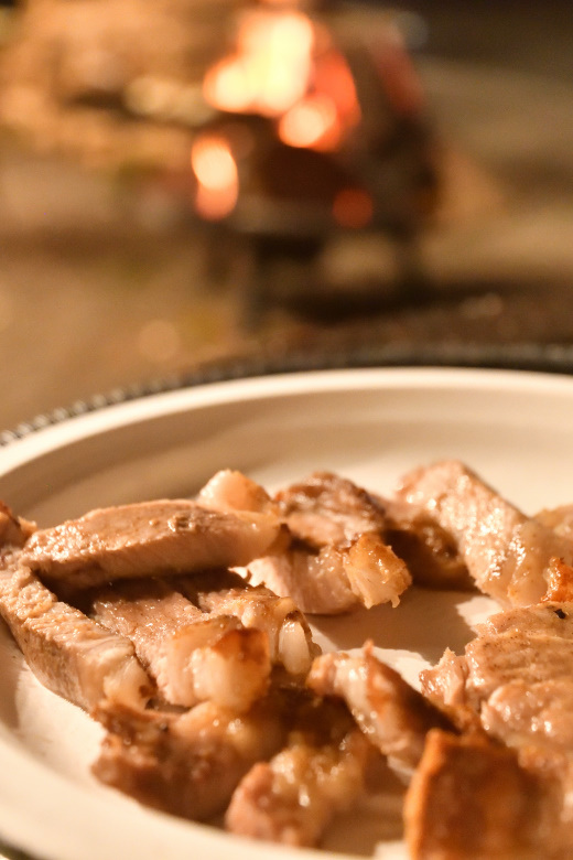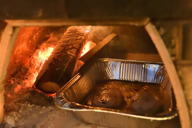ピザ窯の中での焼肉は、鉄板焼きと違ってジワジワとゆっくり熱が加わるので、柔らかく仕上がる