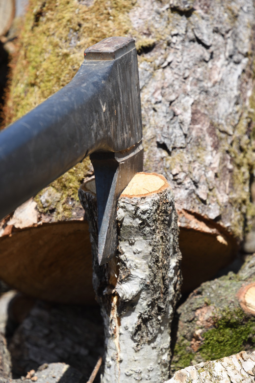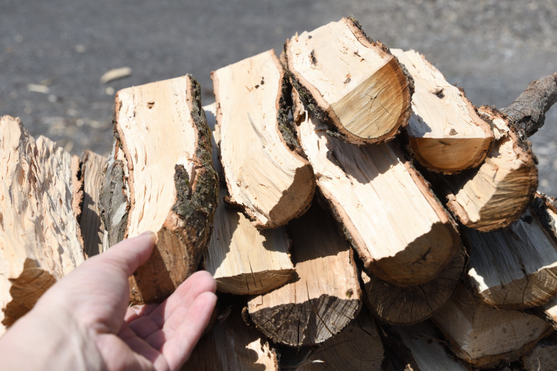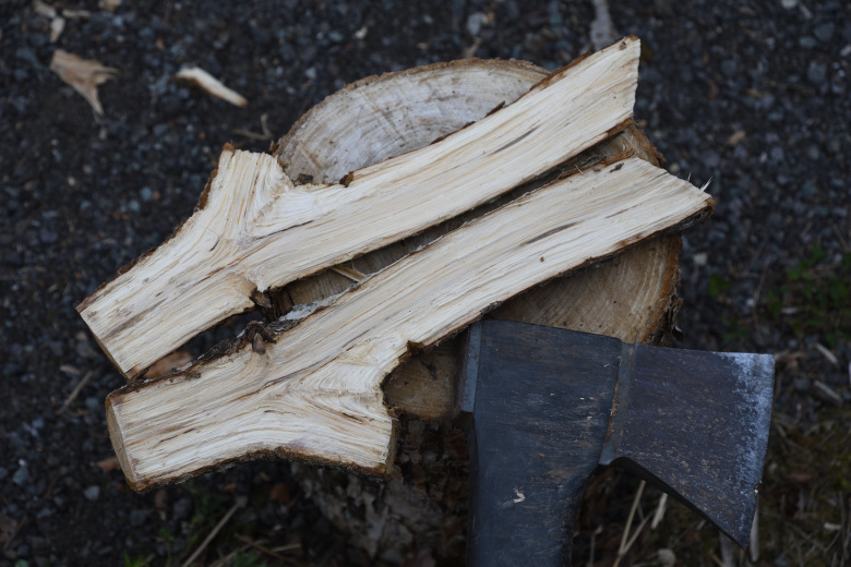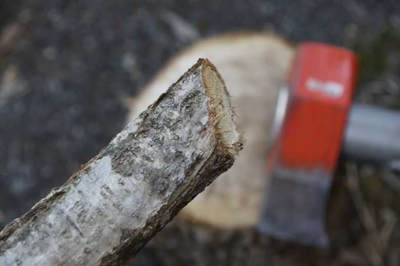 一度、細い枝を割った時に断面を手で触れてみると、いかに水分を含んでいるのかを感じるだろう。細い薪でも、割った方が良いと実感できると思う。