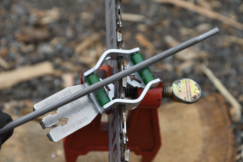 コマメに目立てを行えば刃の形が崩れずに、いつまでも鋭い切れ味を保つことができる。作業後の目立てを行わずに放置して使い続けると、刃の形が崩れていって、切れ味が悪くなるし、研ぐ際の修正が困難となる。目立てゲージで正しい角度と、位置でヤスリを動かすのがお勧めだ。これがあれば初心者でも確実な目立て作業ができる。