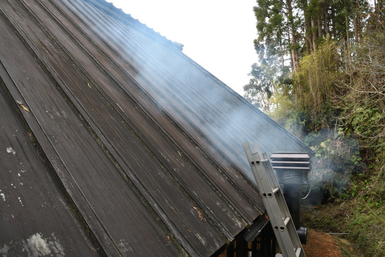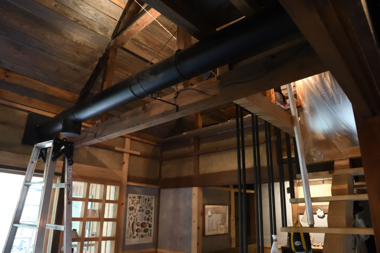 「古民家リフォームで、煙突を屋根から出せない」というような今回のような現場だけでなく、「平屋で十分な煙突高さを得られない」あるいは「高気密高断熱住宅で、煙が室内側に逆流してしまう」というような案件の場合でも、この強制排気ファンを使えば、薪ストーブを快適に使うことができる。