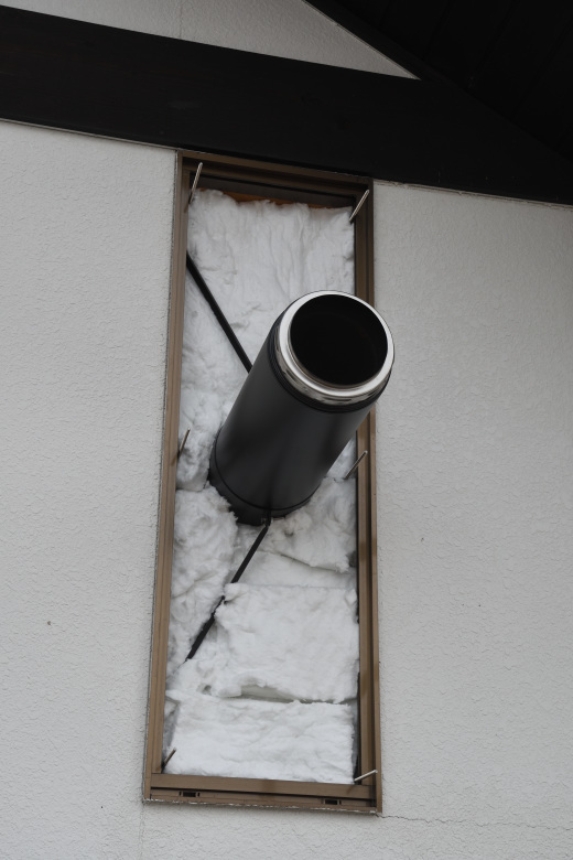 その場合は、壁面貫通となるが、新規で煙突貫通穴を開けることなく、既存のサッシに煙突を通す作戦にした。ちょうど良い位置にハメ殺しのサッシがあったから、それを利用するのが合理的だ。サッシの寸法に合わせて特注で化粧板を作成した。