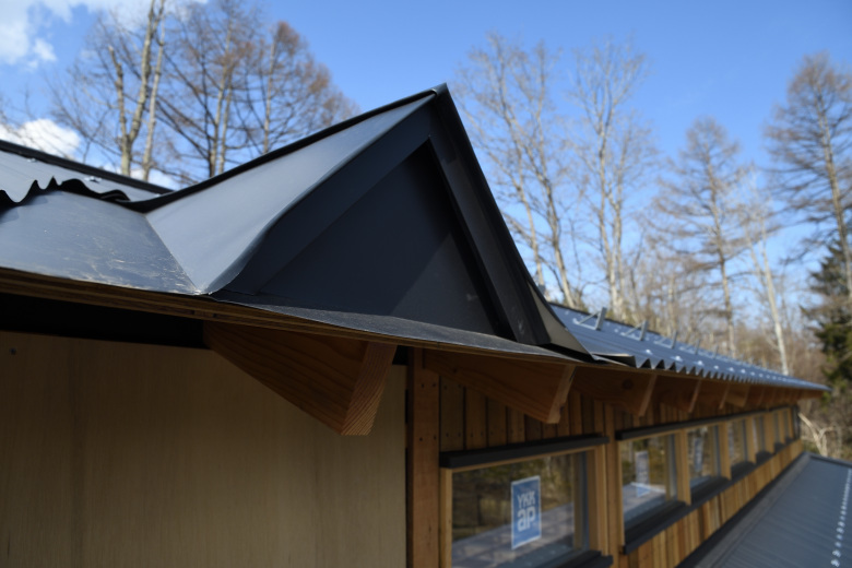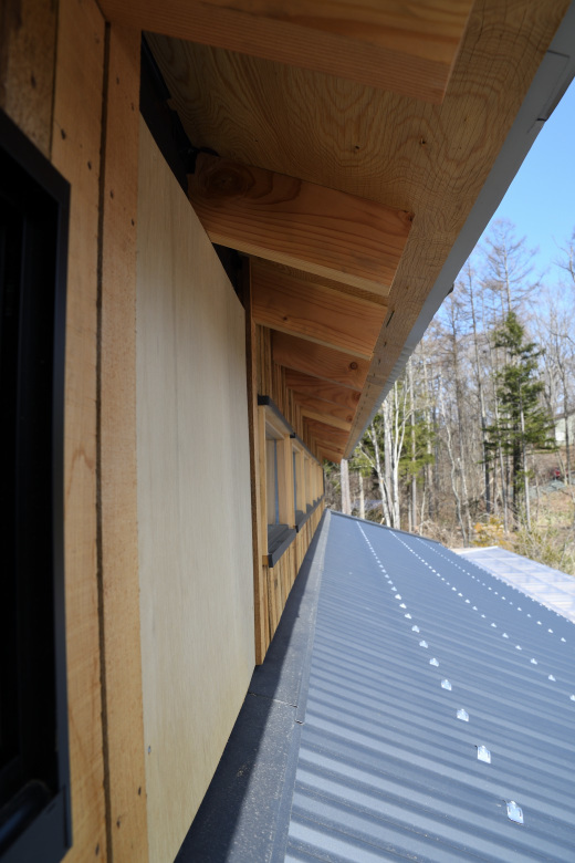 煙突は壁面出しで、立ち上げ位置には雪割りが施工されていた