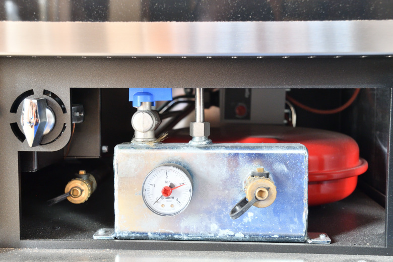 オーブン室の下には圧力計とドレンプラグがある