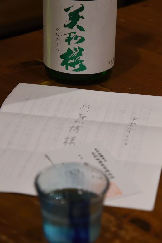 「美和桜」という三次市の酒蔵のもので、純米酒と吟醸酒の2本セットで、純米酒はパンチが効いた感じ、吟醸酒はフルーティでまろやかな感じと、それぞれの味や香りの違いを堪能できる素敵なプレゼントだった。いずれも繊細で味わい深い、美味しいお酒だった。