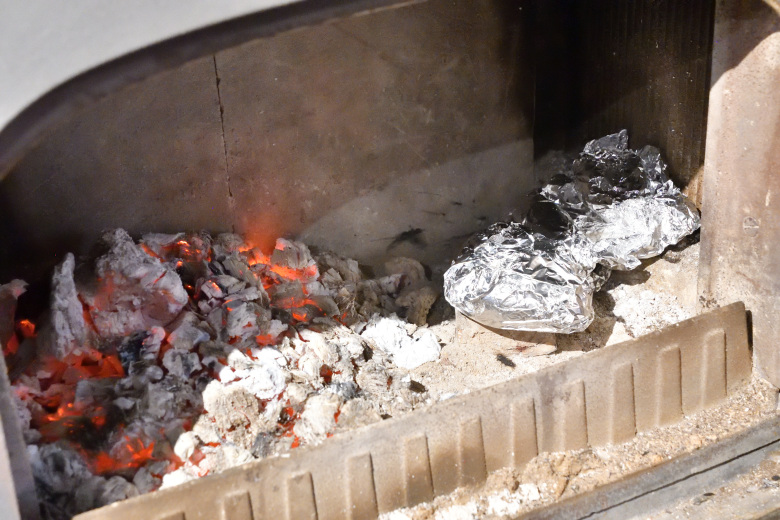 よく炉内に投入しているものを見かけるけど、意外と難しい。熾火が強いと表面が焦げて中が生焼けになりやすい。だいたい1時間ちょっとかけて、完成するくらいの熱量がちょうど良いのだ。灰の中に熾火が残っている程度ならば炉内に投入もありだけど、薪ストーブが本格稼働していて炎が上がっている状況だと炉内では無理がある。