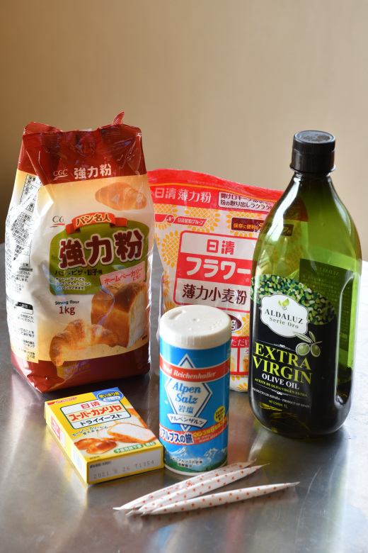 強力粉、薄力粉、イースト菌、塩、砂糖、オリーブオイル、水だけ