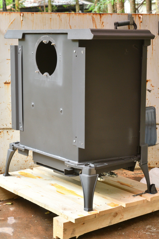 カタログやウェブで見る写真だと、鋳物製の外装パネルをまとっているために、ネスターマーティン独自の鋼板製のウッドボックスと呼ばれる内部の箱を見ることができない。今回は搬入のために軽量化で、側面の外装パネルを取り外したので紹介しよう。ちなみに、外装パネルを取り外すには、背面のパネルを取り外すと、ひっかかって乗っている構造なので、少し後ろ側にずらす感じで下側を持ち上げてやると簡単に外れる。ボルトなどで固定されているわけではない。