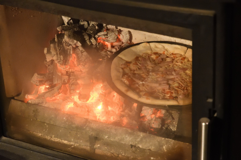 そういう時にはスーパーで売っている市販のチルド食品のピザを買ってくれば手軽に作れる。炉内が熾火の時を見計らって、五徳と、ピアットがあれば簡単だ。