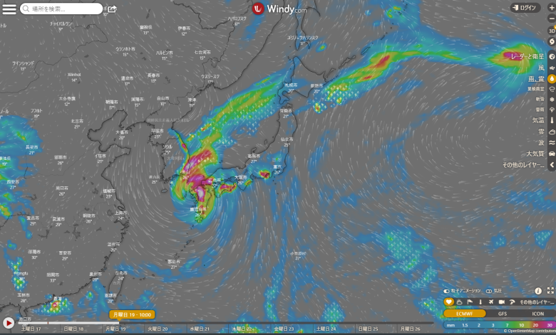 Windyで見ると、台風での風の動きが良くわかる。暖かい湿った空気が流れてきて、台風からはるか離れた場所でも雨になっていく状況が画像を見て直感的に理解できる。工事予定日の朝から雨で、その後は台風の接近に伴って、雨が強くなっていくであろうことが、時間軸を動かしていくと表示される。