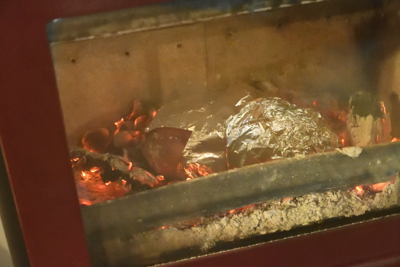 普通は私は天板とか、オーブン室で作るのだけど、今の季節は薪ストーブを一日中焚くことはなく、部屋が暖かくなると薪をくべるのを止めて、鎮火させることも多い。その際、炉内に残った熾火の熱源で、炉内を疑似的なオーブン状態にして焼いた。