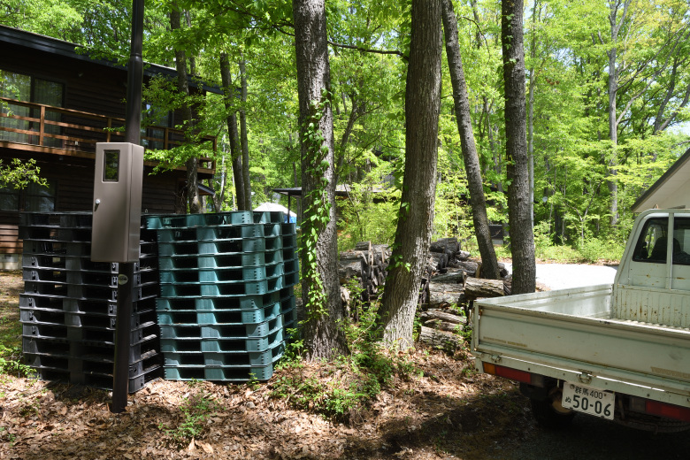 ただ割って地べたに放置しても、薪にならずに腐って土に戻ってしまう。どうするのかお客様と相談した。本格的な薪棚を作る予定はないということなので、なるべくローコストに、そしてスピードも重視するために中古のプラスチックパレットを敷いて、その上に薪を積んで、トラックシートをかけるということにした。