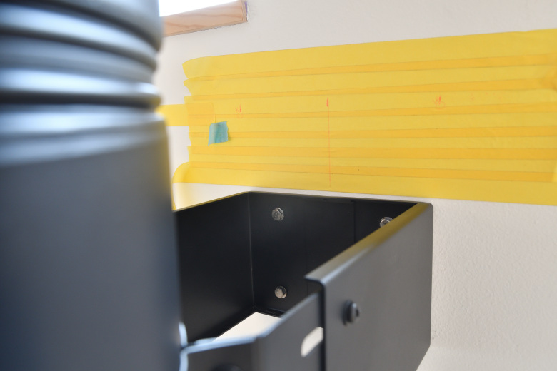 新築の白い壁の場合は下手に差し金を当てたりするだけで、傷ついたり、汚れたりするので、まずは養生テープを貼って、作業位置に直接工具が当たらないようにする。