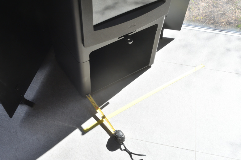 タイルの対角にマスキングテープを貼って、薪ストーブの前面との距離を測る