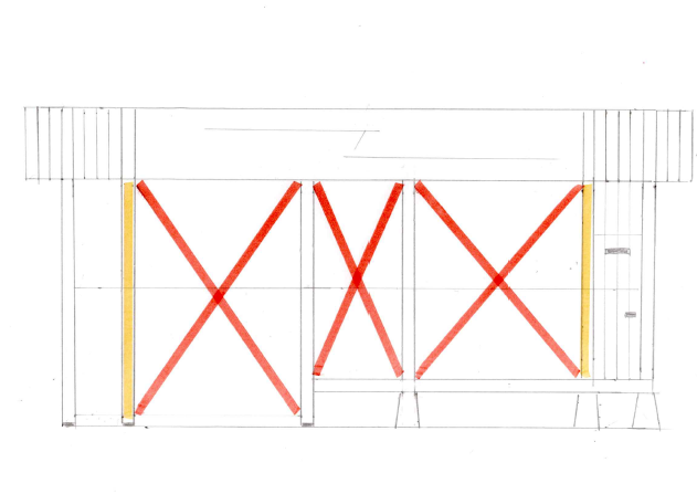 中央部分には筋交いも入れて、薪の収納には邪魔にならず、かつ強度を確保できる設計となっている。また、店頭にあるので、一部、郵便受け、宅配便ボックス、雪かき道具などの収納スペースも設ける予定だ。