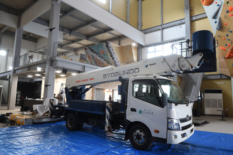 2024年7月8日(月)に寒河江市にオープンする、国内最大級のクライミング施設「ノバリア」で、煙突工事、薪ストーブ設置工事の初日の様子だ。