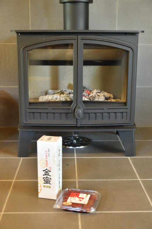 ハンターストーブの最新モデル「ヘラルド14エコ」の前での、限定品のプレミアムみかんジュースと、無添加の梅干だ。