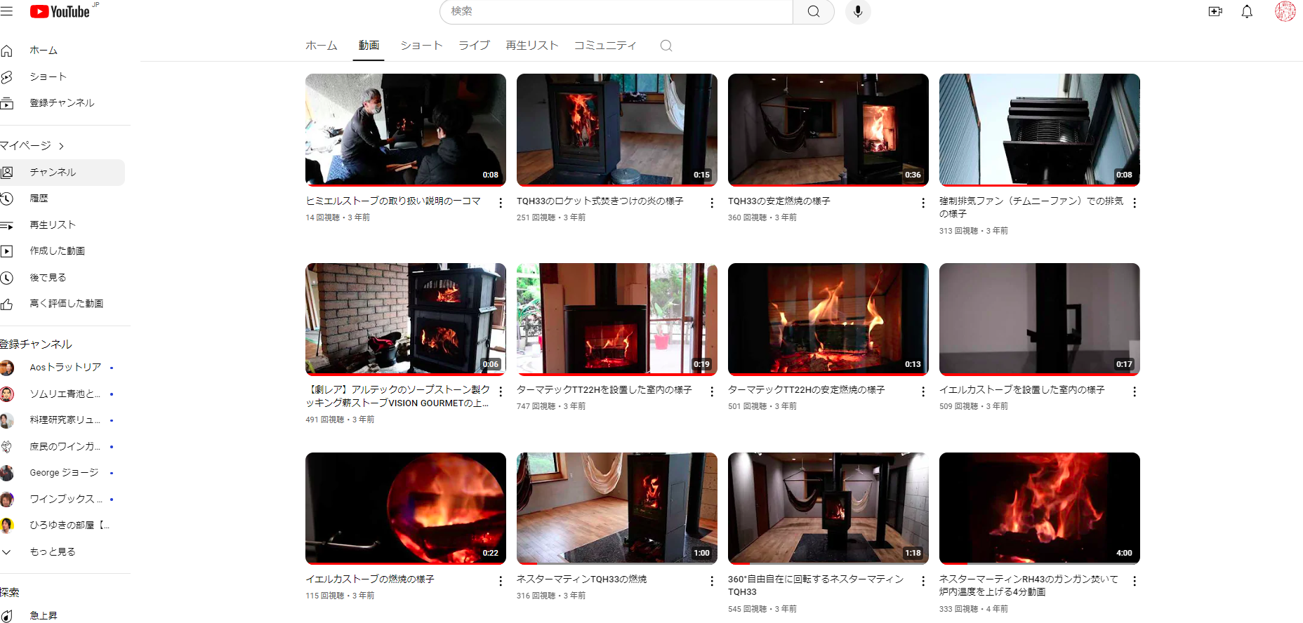 まずやったことは、薪ストーブと関係ない動画を「限定公開」にして、一般の視聴者からは見えないようにした。実は過去動画には旅行、サーキット走行の動画など、薪ストーブに全然関係ない動画もけっこうあったので、これだと何のチャンネルか意味不明になってしまう。