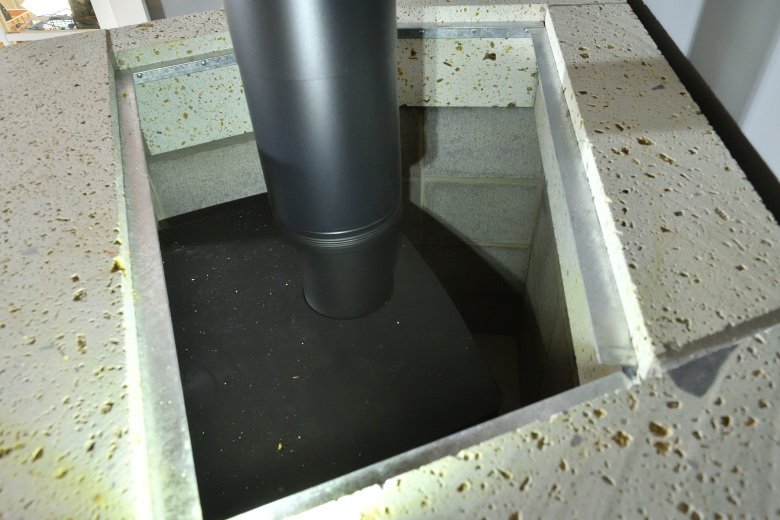 薪ストーブを石の中に入れて煙突をつなぐ