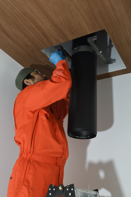 天井へ貫通部分から、もう一本煙突を伸ばして、そこに下げ振りやレーザーを当てて、確実に垂直になっていることを確認してから、固定する。