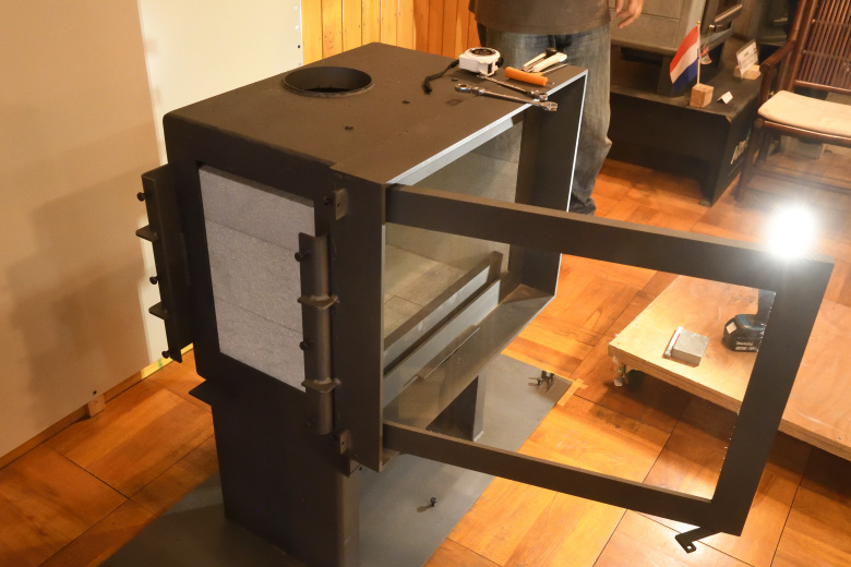 まずは炉内パーツを組み込んでいく。普通の薪ストーブと同様に、ソープストーンが側面、背面、底面に組み込まれていて、上部はバーミキュライトのバッフル板の構成だ。バッフル板の上部は金属製の折り返しの板が組み込まれていて、排気経路が長くなるような設計となっている。