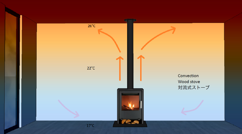 まず鉄の薪ストーブは機種にもよるけど、表面温度が250-300℃程度と比較的高い。「表面温度が高ければ高いほど部屋が暖かくなる」と一般的なイメージで考えてしまう人が多いけど、実はその逆だ。薪ストーブの表面温度が高いと、薪ストーブ付近の空気が熱せられて、天井付近の室温がかなり高くなる。その結果、室内の空気の対流が発生して床付近の温度が低くなるという現象が発生する。