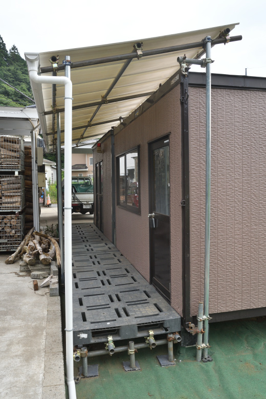 雨樋いをつけないと、積んである薪の方に雨水が垂れてしまうので、雨樋を取り付けて敷地の外に雨水が流れていくように処理した。