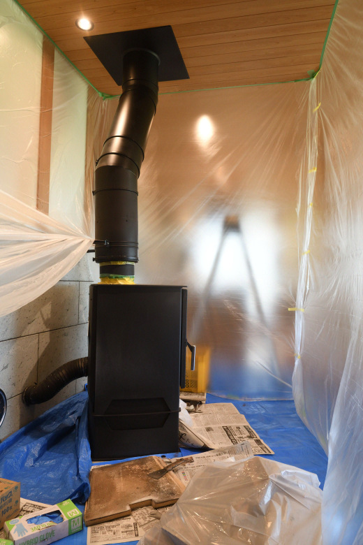 薪ストーブが設置してある部屋の一部を養生して壁を作る