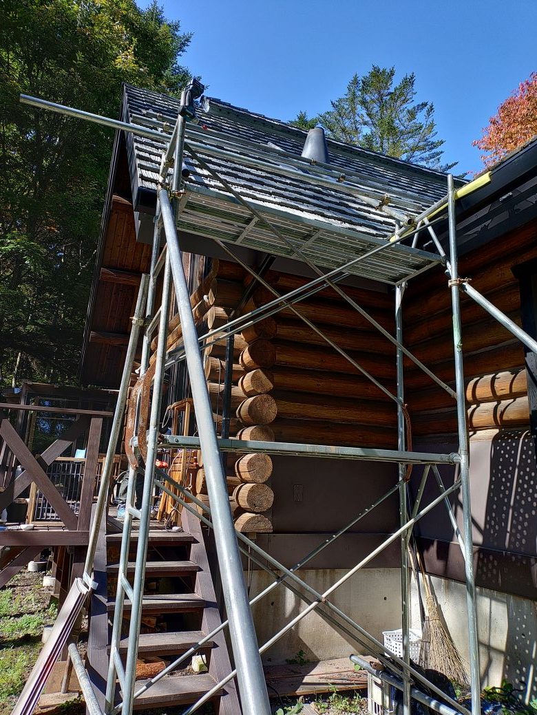 煙突を入れ替える必要があるけど、既存の屋根とフラッシングの取り合い部分をいじると大掛かりな工事となってしまって予算が合わなくなる。そのため、フラッシングの上端をサンダーで切断して広げて、既存の煙突は室内側からアクセスしてルーフサポートを切断して撤去、そして外径200の新宮商行のSCS匠の二重断熱煙突へ入れ替えるという、これまで未経験の対応となった。