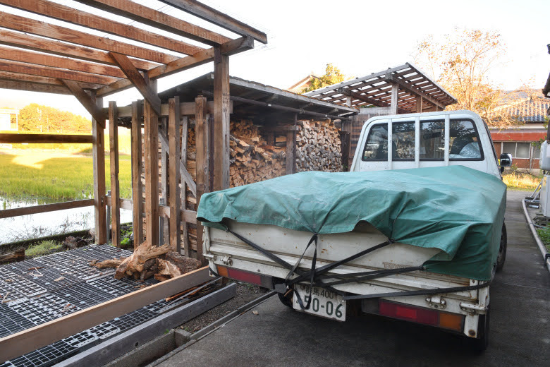 工事の途中にそのお客さんからメールが入っていて「煙突掃除のついでに薪も100キロだけ持ってきて欲しい」とのことだった。岩城さんに相談して、100キロだけ仕入れさせてもらうことができた。工事の後、岩城さんの店に戻ってから積み込みさせてもらった。