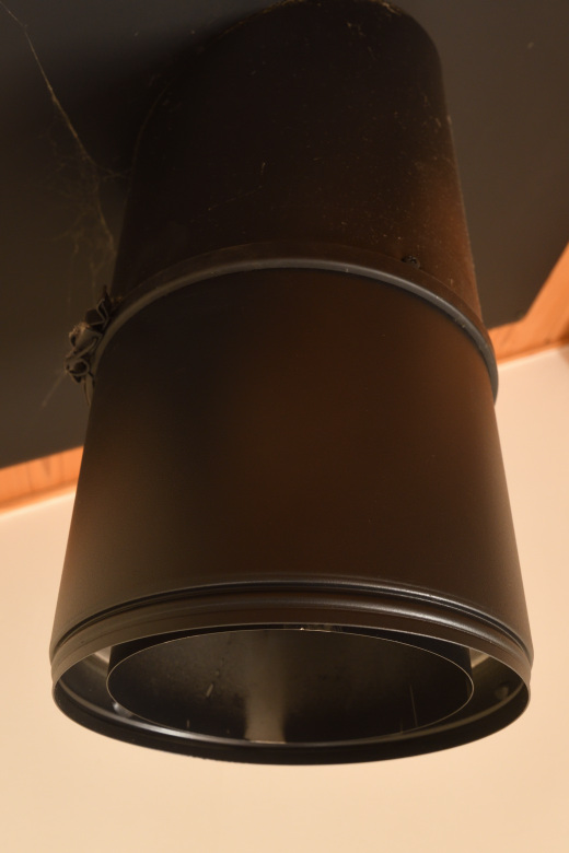 なんとかシングル煙突を撤去した後に、既存煙突と新宮商行SCS匠のアダプターを取り付ける。ドブレの薪ストーブで煙突トップも高木製だったのでメトス施工かと思っていたのだが、高木用のアダプターを当ててみるが、なんと入らない。最近このパターンもけっこうある。念のためにと高木用ではない、他社製用のアダプターも持参していたので、そちらを当ててみたら適合したので無事に接続できた。