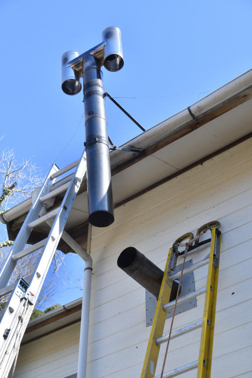 壁出しのシングル煙突で、煙突掃除できない絶望的な設置状況。「なんとかして」と言われて、二重断熱煙突へ全交換の提案をしたけど「そこまで予算がない」ということになった。折れ曲がり部分だけ、蓋付きの物に交換することになった。