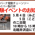 今年のGW後半の4日と5日の二日間(10時から15時まで)、かわはら薪ストーブ本舗北軽井沢店にて、最新のハスクバーナのバッテリーチェ...