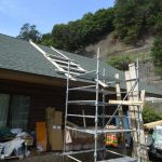 室内側から順次上方向へ煙突芯の位置を移していき、最終的に野地板の上に穴を開けて煙突芯の位置を出す。 その部分を狙って、足場を組んでいき...